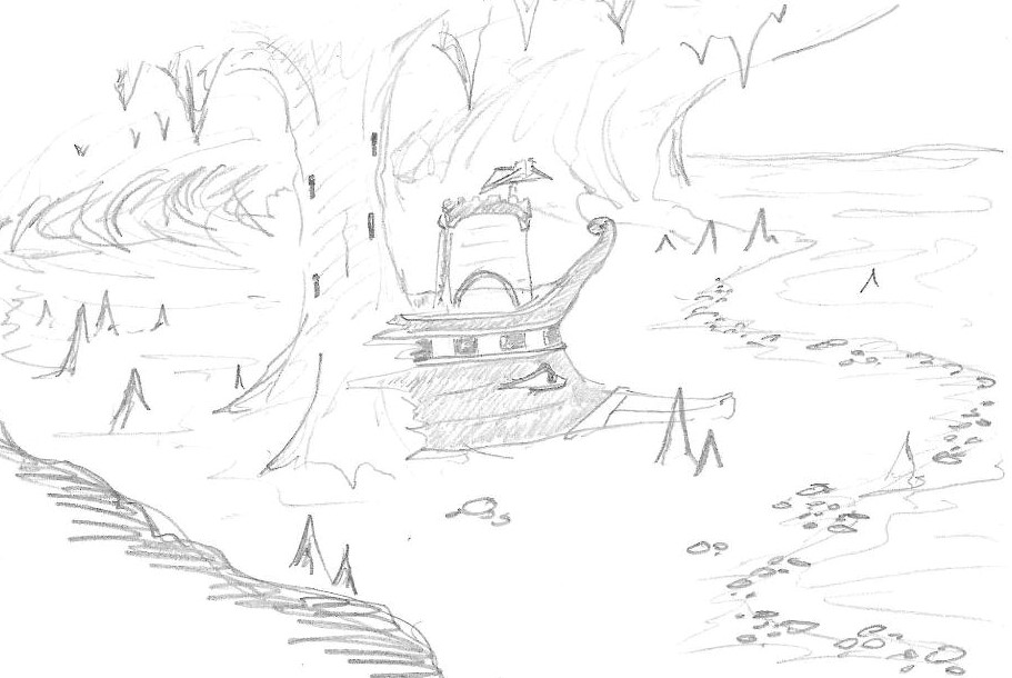 Later when our raid on the pirates began we found a door set in the bottom of a stone column with a staircase leading up. What we found above was a base carved above the roof of the cave. My architecturally trained eyes were able to see that this was no fort slapped together with wood and nails. The supports were expertly joined and the rock precisely craved, no pirates did this.